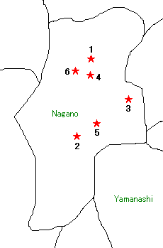 | ★1 長野オリンピックスタジアム ★2 諏訪湖湖上花火大会 ★3 千曲川納涼花火大会 ★4 戸倉温泉納涼煙火大会 ★5 白樺高原花火大会 ★6 聖高原納涼煙火大会 |