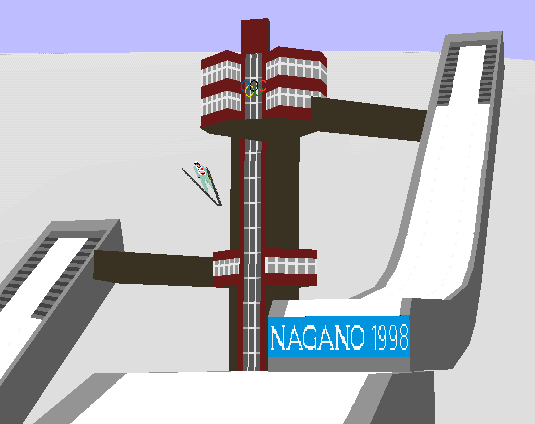 | あの感動の長野オリンピックのスキー・ジャンプ団体戦を作りました。 ジャンプ台・観客席・聖火・得点板、そして動く原田選手を再現してあります。FS6(=FS95)/FS98両用です。 |