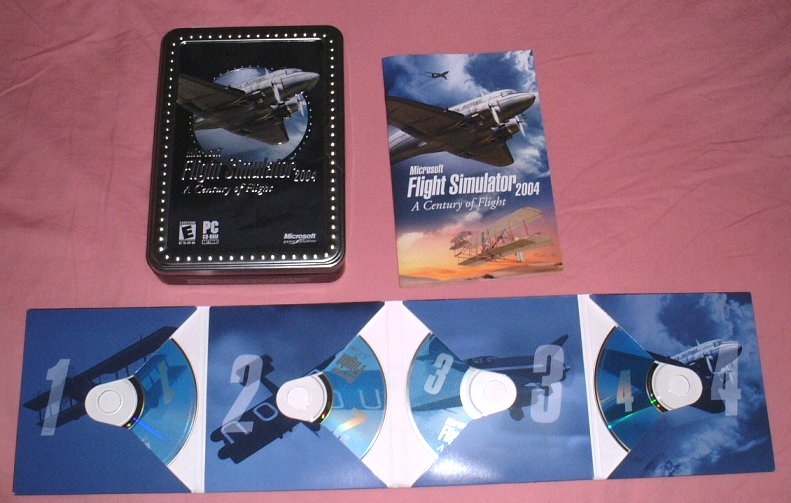 FS2002の時のチープなイメージとは全く逆に、FS2004は金属の缶に入っていて結構かっこいいです。(お菓子の缶のように見えないこともないですが・・・・)CDは4枚組みで、相変わらずの紙ケースですが、FS2002のようにぶつかって傷が付くことはありません。第一印象は○です。