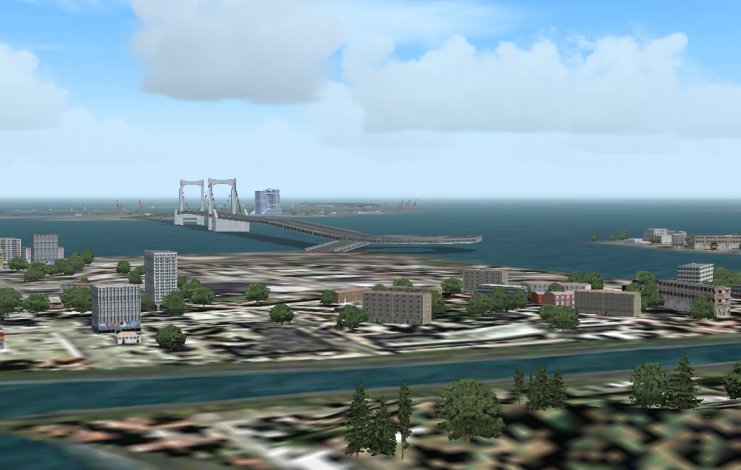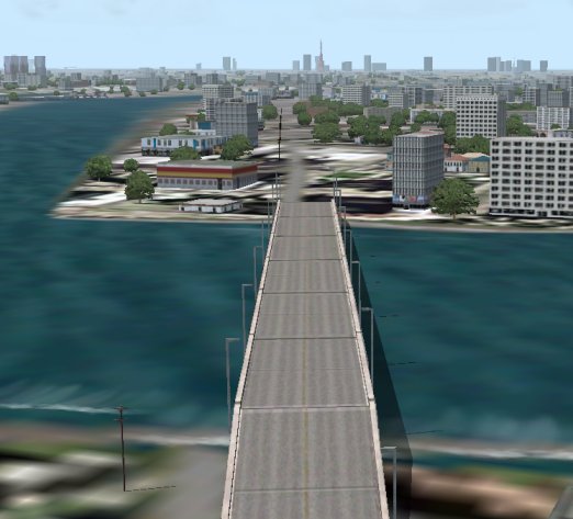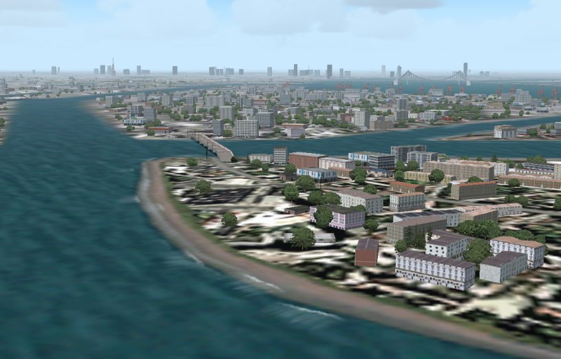 ご存知京浜島ですが、周知の通りマイクロソフト・デフォルトシーナリーは、島の形は適当で、都心部分の土地は4倍くらいの面積に拡大されているし、とても不自然で本物とは似ても似つきません。でも、ここで無心にこれをもう一回見てください。明らかに本物より美しいと思いませんか?過密に建てられた住宅や工場・いつも渋滞している一般道路と高速道路・ほとんど緑もなく家と家との間の空間すらなくて日が当たらない環境・・・など現実の東京の全てがありません。しかも海岸はのどかな砂浜で、京浜島ビーチとでも呼びたくなる程の美しさ。そこらじゅうにある空き地や十分広い家と家との間隔、いかにも人口密度の低そうな町並み、ところどころに十分ある緑。もしこういう世界があって、ここに住んだら良い人生が送れそうな予感??