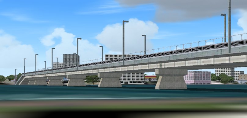 島の北端の砂浜に座って、のんびり橋を見上げてください。FS2004からすばらしい雲が現れましたが、これはまさに日本の夏空です。寄せる波と綺麗な海と空気と夏の空、都市の機能である橋やピンクのビルはありますが、風景に溶け込んでいるようで、現在の実社会の建築物とは明らかに異なっています。