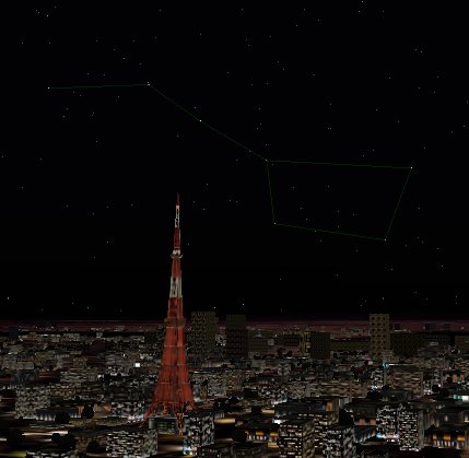 Real Stars V1.0 です。FS2002用ですが、FS2004でもちゃんと動きます。要するに、肉眼で見える星9095個のデータが入っているのです。データの中を開けて、Constellations=0 になってるのを 1 にしてみて下さい。星座の形の線が入ります。写真ではかなり薄いですがFS上ではそこそこです。ただ、残念なことに北斗七星と2・3の星しか線のデータは入っていません。根性のある方は全星座データ制覇に挑戦されてはいかがでしょうか。星座表から星の番号を割り出してそのデータを書けばできると思われます。