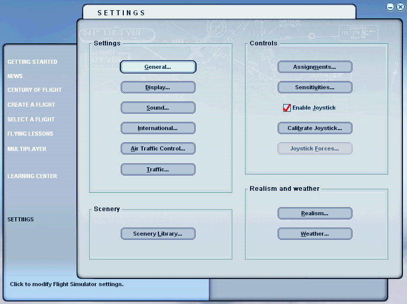 インストールは無事に終わり起動します。ここまでは平和です。デフォルトではフルスクリーン・モードで立ち上がるので、(Alt+Enter)でWindowモードにしたりしてみます。さてと、ここでまた変人モードで、飛ばずにシーナリー・ライブラリーを追加・・・となるのですが、メニューをいじってみても何かおかしいです。