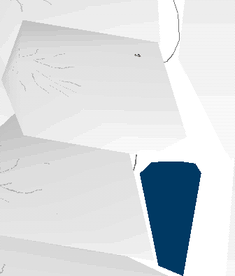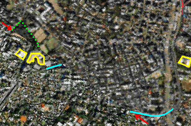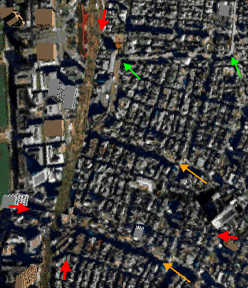 次は、港区元麻布付近です。赤い矢印は同様にテクスチャーの境界です。空色の線は首都高速2号目黒線で、見事に切れています。そして緑の点々は、有栖川公園ですが、有栖川公園の南側のほとんどと、地下鉄日比谷線の広尾駅周辺・ドイツ大使館・フランス大使館・四の橋あたりがことごとく消えています。有栖川公園を消すとは個人的には大変不満です。なお、黄色のところは左は広尾病院・その隣が慶応義塾幼稚舎・右はオーストラリア大使館ですが、知っているひとが見れば一目瞭然な通り、実際は同じ緯度のわけはありません。