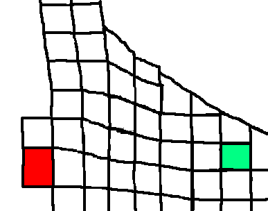 これをご覧ください。これがずらしの現状です。緑色の領域は、位置のずれがない横浜中心部です。赤は、厚木基地です。北東にずれている上、南北に伸びています。その中間の領域は、少しづつ正方形から歪んだ形になっています。これを調布についても行うため、上の方では少しづつ左へ歪んでいます。これをやると大変手間がかかりますが、道路や線路の連続性が保たれ、かつトワイライト東京シーナリーとの互換性も保たれます。