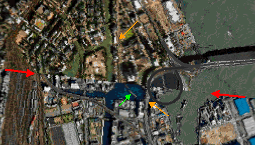 これは、レインボーブリッジの西側のテクスチャーです。2つの赤い矢印は、テクスチャーの境界です。すぐにわかるとおり、境界の上下では海の色が全く異なっており、さらに海岸線も完全に不連続になっています。(レインボーブリッジ自体は3Dオブジェクトなのでテクスチャーの継ぎ目の影響はありません。)2つのオレンジ色の矢印は、首都高速羽田線です。このように完全に左右に切れています。緑色の矢印は、東京モノレールの軌道です。トワイライトのシーナリーでの首都高(夜のライトのみ作成してあります。)では、このモノレールの軌道を首都高とみなすことによって、強引に上下の道路をつなげています。確かにモノレールの軌道を知らない人をだますには良い手法ですが、ちょっと折れ線の首都高になってしまいます。