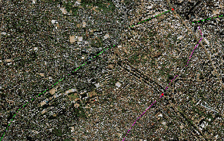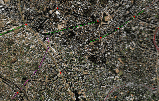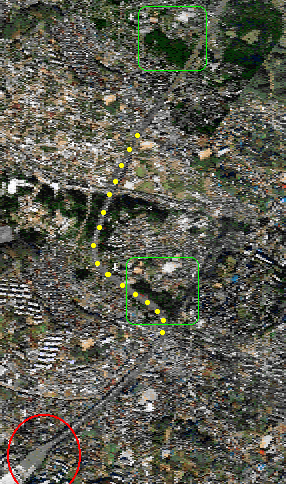 今度は逆に同じ物体が重複している例です。これはちょっと離れまして東名高速道路の東京料金所付近です。赤丸が東京料金所です。緑のところは全く同じ風景で重複しています。場所は、川崎市宮前区の等覚院です。黄色の点々は、トワイライトさんのところで強引に線を書いて道路を作った個所です。このように高速道路なのにヘアピンカーブができてしまいます。(まあいつも渋滞している東名なので、たとえ本物がそうなっていても事故にはならないかもしれませんが??)