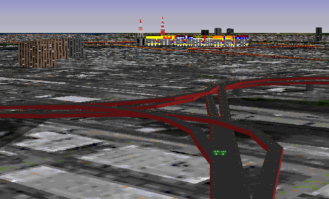 狭い土地に本物の首都高を作るのがいかに大変かがわかります。遠くに銀座のビル群・東京タワーが見えます。