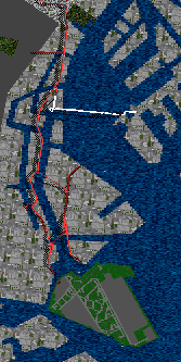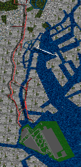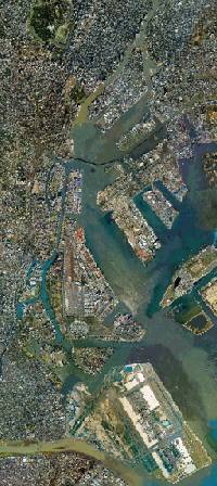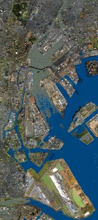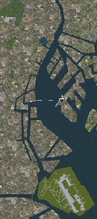 | 海岸線・埋立地の島の数・建造物の位置寸法方角がかなり狂っている。都心部が約2倍にデフォルメされている。 | 衛星写真を使用して殆ど実際の座標に近く配置されている。 | 地図に基づいた座標に配置されている。 | ||||