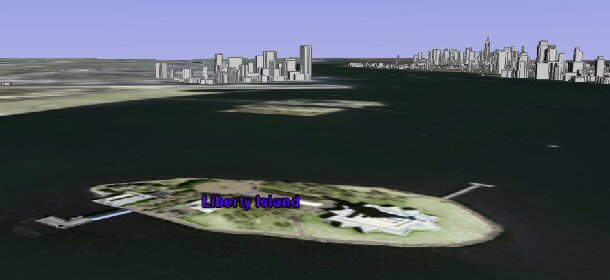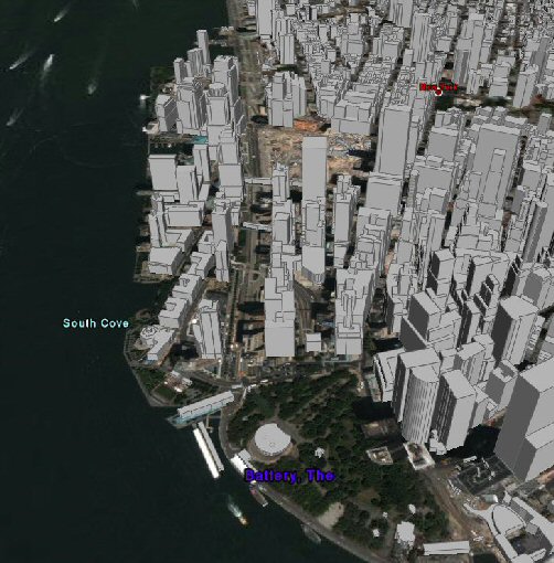 バッテリーパークとグラウンド・ゼロです。3Dのビル付きなので雰囲気出ています(でもテクスチャー無いですが)。これは World Wind では出せない風景です。