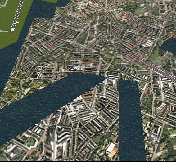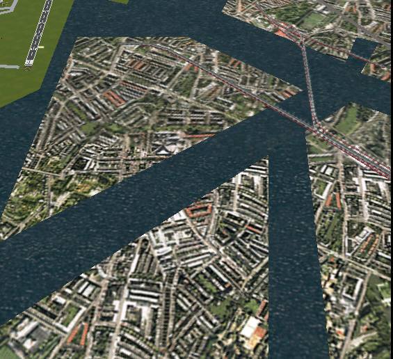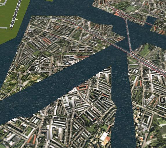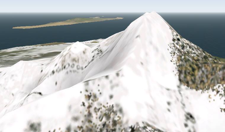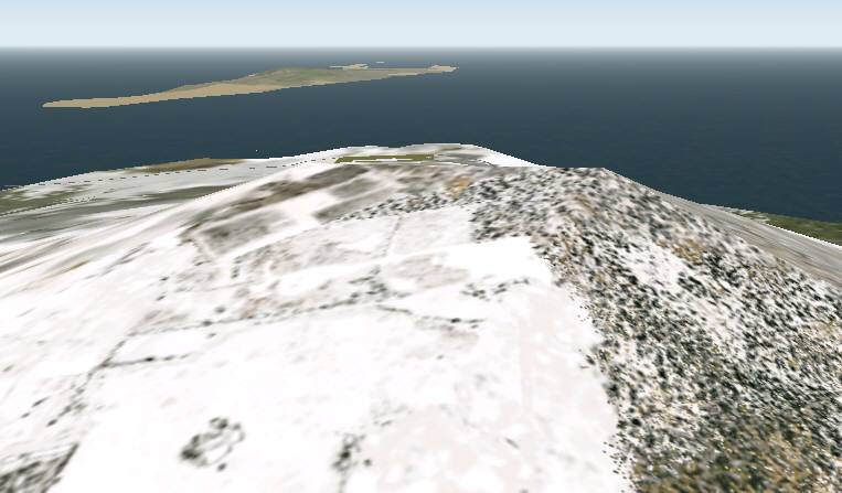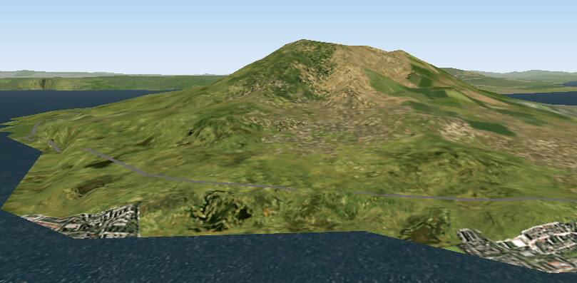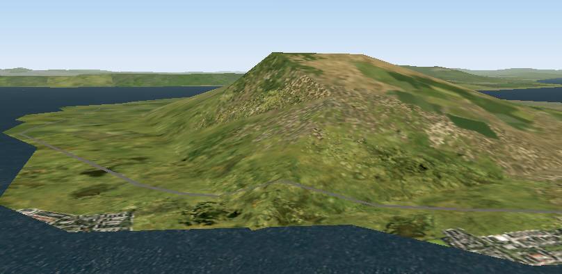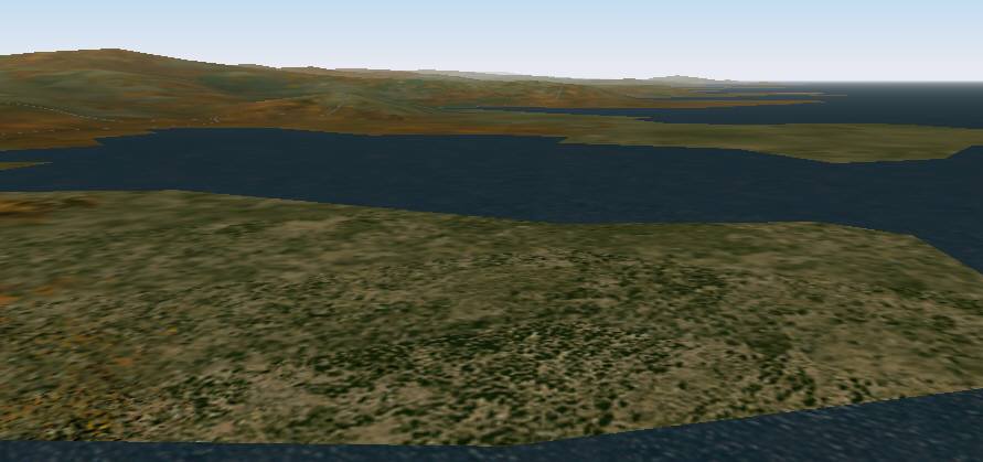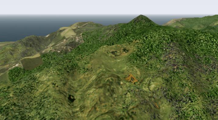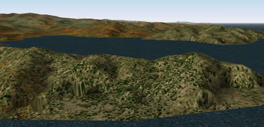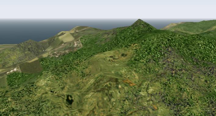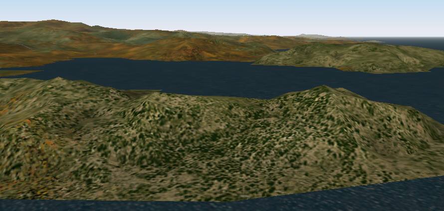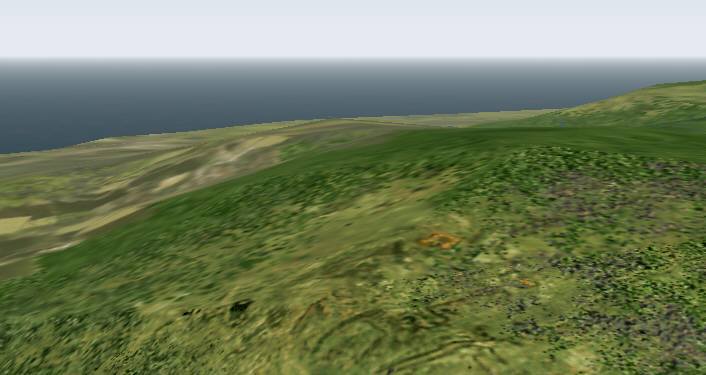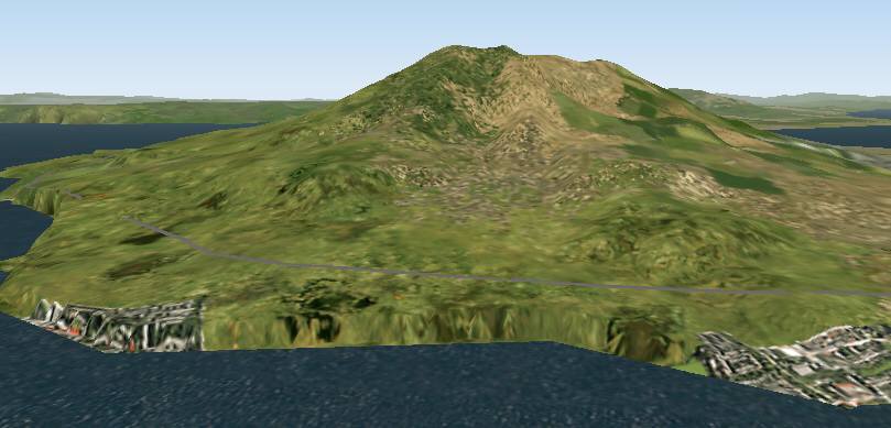 jterrainのシーナリー たまたまサンプリング間隔のせいか、島が陸続きに見えています。手前の城南島にやや大きい地盤の陥没の穴があります。