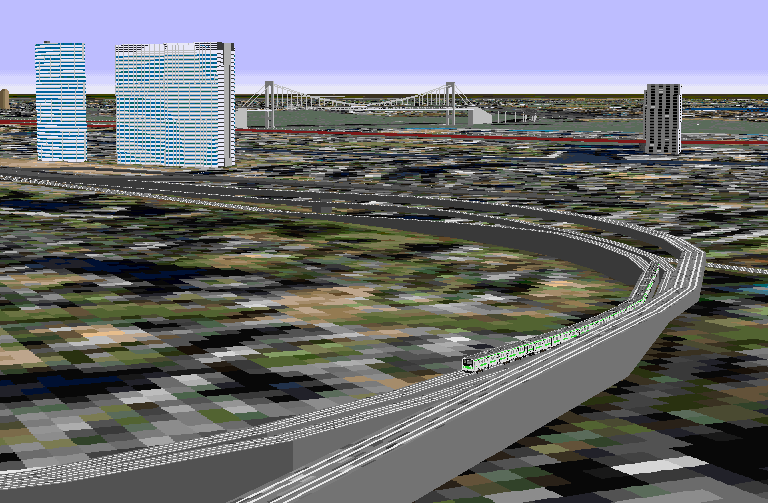 衛星写真は遠景が非常に美しいので、このシーナリーでは visibility を下げて、ある程度近づかないと首都高が現れないように設定しました。ヒステリシス効果のため道路が見えてこない事がありますが、それはこのためです。その場合は旋回を繰り返すか、Slewモードまたは直接経緯度指定により見てください。