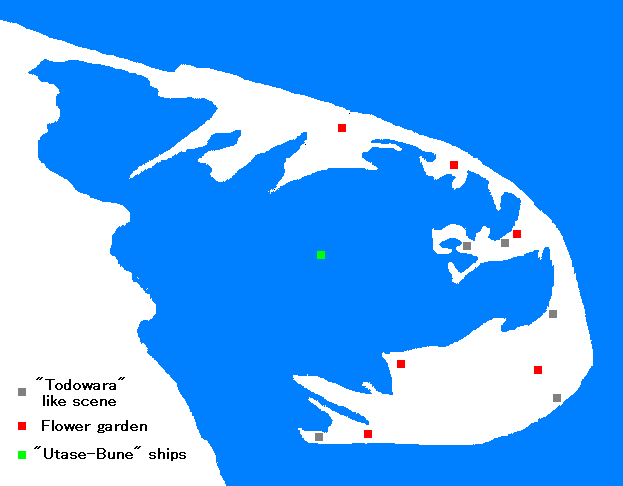There are "Todowara" rottted trees, primeval flower gardens, and "Utase-Bune" ships. It seems that in the case of seeing desolate Todowara trees, full screen mode (Alt + Enter) is better. In the case of seeing flowers, not full screen mode is better. It depends on your feeling....