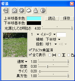 ところで、Shade の背景ウィンドウ。左の絵のように、イメージ(草っ原のbmpファイル)を指定してやっても、決して Poser の背景のようにイメージがそのまま背景に出ずに、ぐじゃっと歪んで出てくるのは何ででしょうか。相変わらず脳が狂っているのでマニュアルの該当ページを読んでも全く理解不能です。投影の平面・球1・球2とは何でしょう。平面を選んでも普通に出ないのはなぜでしょう。そもそも、背景を読み込むと、「背景設定ファイル(*.shdbgr, *.xmlshdbgr)」と出るのですが、何でこういう変な特殊フォーマットなんでしょうか。以上 Shade で理解不能な点です。