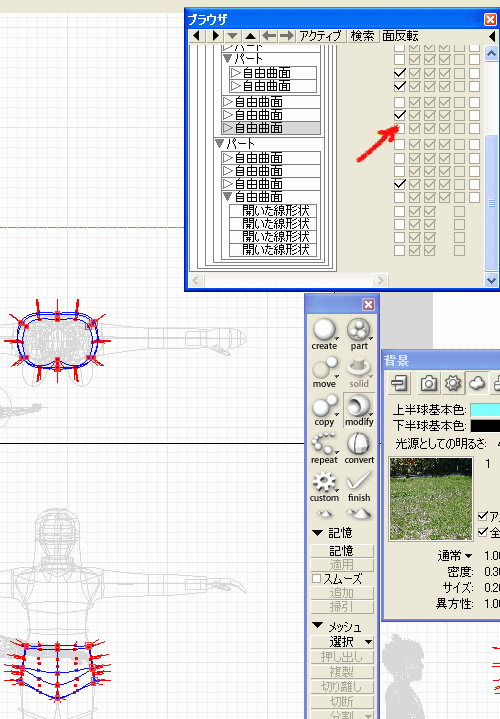 この例では、左から2番目のおばさんと全く面を反転して読んでみました。するとちょうどこの絵と逆の状態、つまりズボンの足がちゃんと青くて腹が金色になりました。そこで Shade に戻って、腹に相当する自由曲面をブラウザで探します。そして、左図の赤い矢印の面反転をチェックします。もし既にチェックしてあれば逆にそれをはずします。これがポイントのようです。つまり、ここにチェックがあるかないか、という絶対的状態が問題なのではなく、ダメなところは逆にすればよい という相対的価値観の問題のようです。(尚、以上の実験は全て Poser4 レンダラーでやっています。FireFlyでやると、原因不明ですが、全然とほほなダメな絵になります。こっちの方の原因は全くわかりません。)