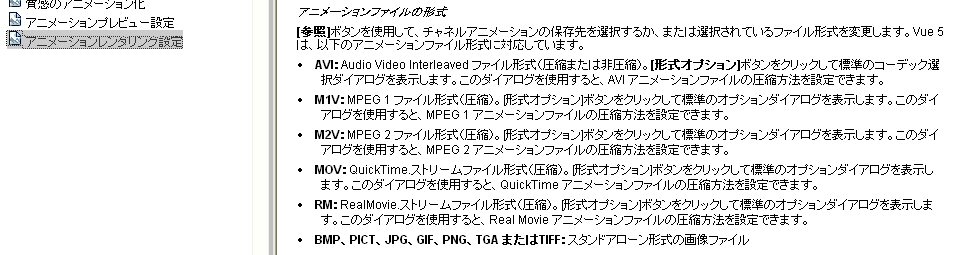 上記7月17日の話なんですが、Shade などを見ると、音声付きアニメーションは始めから頭に無いようですし、Poser では音声付きアニメができると特記してあります。また、一般世間で言うアニメーションとは、TV番組などでは音声付きが当たり前ですし、GIFアニメーションとか言えば音声無しが当たり前です。ということは、Vue にはアニメーションの音声付加機能が無いのが「仕様」である可能性もあるかもしれません。しかし、Vue のサイトに Vue で作った音楽付きアニメーションがある以上、それは許されないのではないでしょうか。さらにここには、「Mover 5があれば、Poser 4〜6のアニメーション付きシーンを完全な形で取り込むことができます。」とありますね。音声が無いアニメーションは絶対完全ではないですね。まあ、まだ回答が来ないのでわかりませんが。