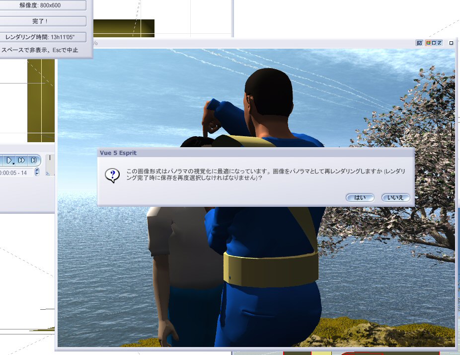 回答待ちですが、13時間レンダリングした後でこう来ると、結構頭にきますね。解決されなければ、イー・フロンティアに返金請求して、かつ、「Vueは使えないソフト」とここで宣言しますが、どうなるんですかね。