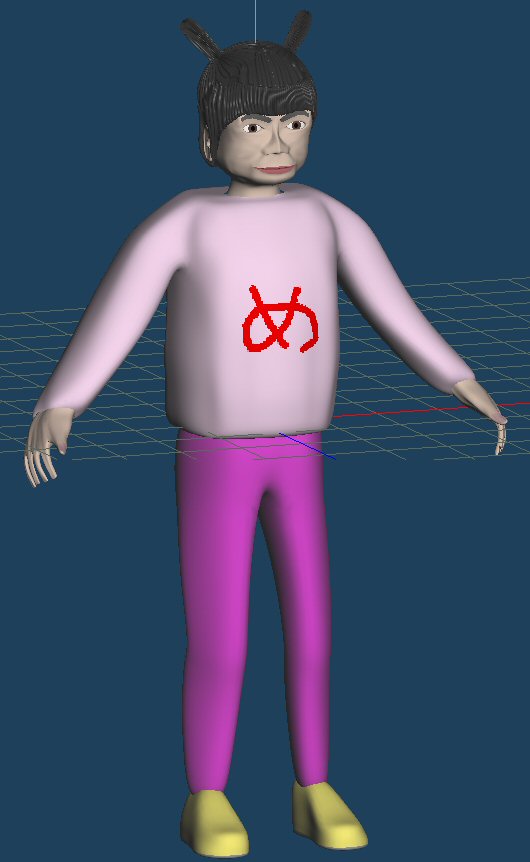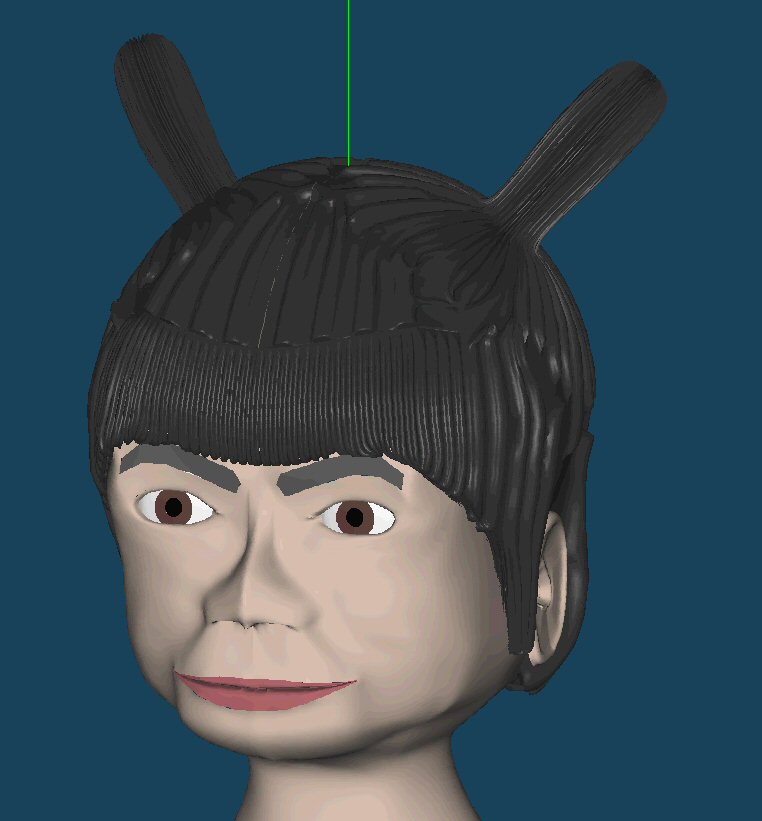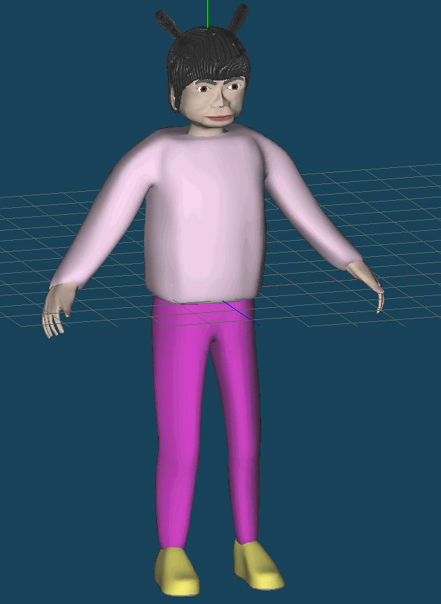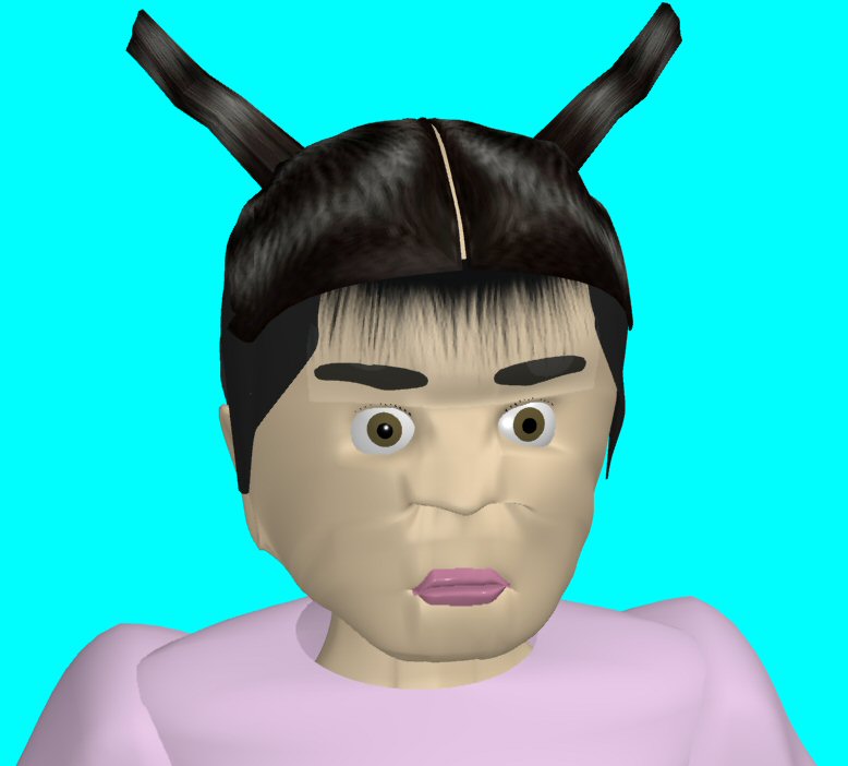 髪の毛を束ねたその先の、長さや上下前後位置はモーフ・パラメータでいじれるので、この写真のように先端を上にすることはできます。しかし、髪の毛を「束ねる位置」が、どうしても変更不可能でした。ここで、変人の異常な意地が出てくるのですが、めぐちゃんの髪型は、決して「おさげ」ではなく、オリジナルの「ダブルちょんちょこりん」なのです。良くオリジナルの絵を見ていただくとわかりますが、めぐちゃんはもっと上のほうで髪を束ねています。決しておさげではありません。