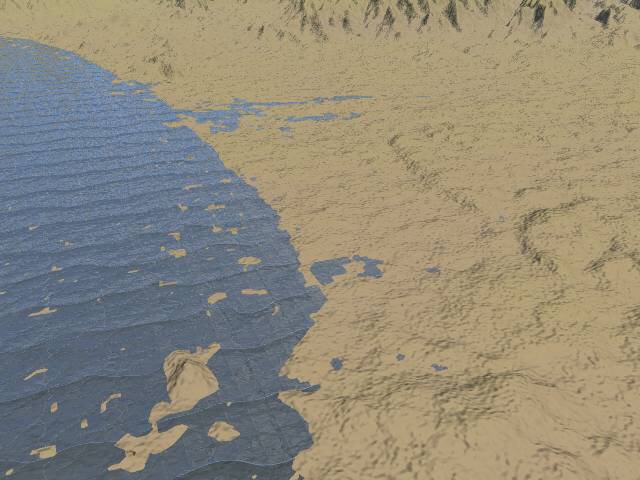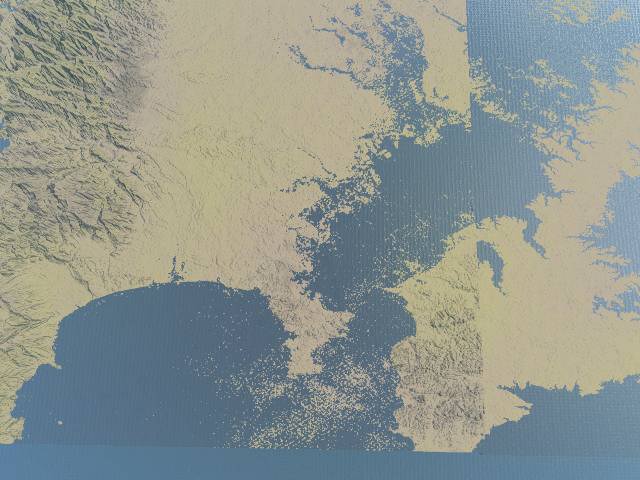 結局関東地方はこの程度でした。左は江ノ島と相模川河口のアップ、右は三浦半島から東京湾、房総半島までです。このように、東京の下町と千葉が水没したり、東京湾に島ができてしまったり、もろに地図のつなぎ目が見えてしまったり、全然ダメです。富士山辺りは綺麗に出るようでしたが。水面高度の設定がかなり微妙です。