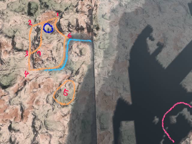 右下のピンクがお台場、左半分の空色の線が古川、オレンジが主な道路、1が六本木、2が西麻布、3が広尾、4が天現寺橋、5が高輪台、6が一の橋、7が有栖川公園の北側高台部分、そして青丸が六本木ヒルズではないでしょうか。