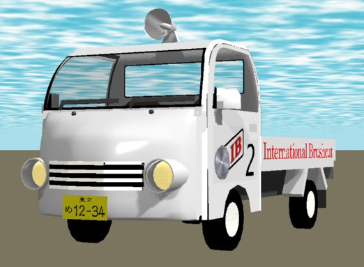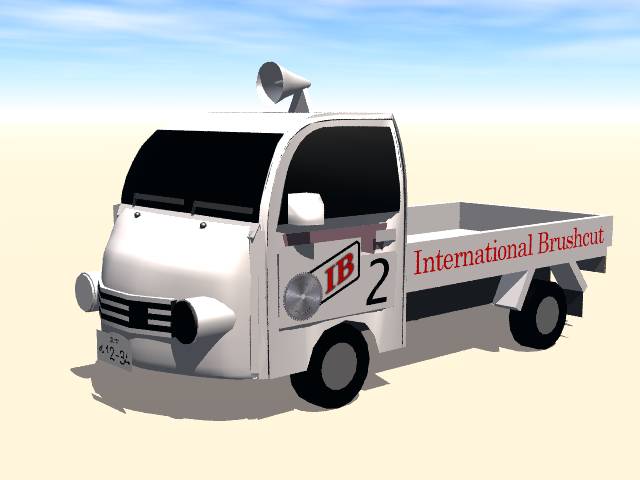 その軽トラックを Shade から Poser へ移してみると、形状はともかくテクスチャーとか全然互換性がなく使えません。また、Shade から直接 Vue に移してみても、やはり使えない程度にしか互換性がありません。そして左の絵は、Shade から一旦 obj 形式で書き出してからそれを Vue で読んでみたもので、Shade 形式で読むよりはマシですが、やはり随分抜け落ちている情報があります。窓ガラスも真っ黒です。このように、3DCGの世界って、互換性があるというのは使えるという意味ではなく、かろうじて読めるだけという事なんですね。人間社会のようで嫌ですね。誰も人材募集の会社案内に、「当社にはこういう変な奴もいます・・・」とか書かないですからね。