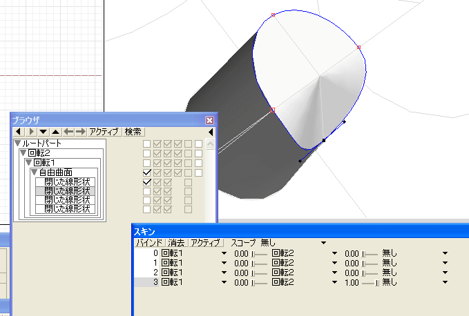 本を見ると、変形ジョイントでやると書いてある本もあれば、回転ジョイントとスキンでやると書いてある本もあったのですが、後者でやってみました。昔の本ではスキンジョイントと書いてありますが、Shade 7.5 では、表示メニューからスキンを選ぶとこれが出てきますね。