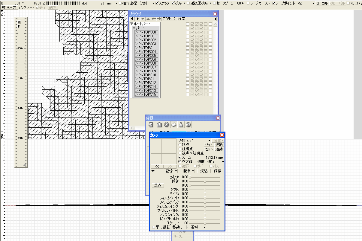 そして右の絵は、DXF ファイルなら Shade でも読めるはずなので読んでみた結果。確かに3面図上に物体は現れるのですが、カメラ上には何も表示されず。やはり原因不明です。Vue も Shade も DXF ファイル読めると明言しているのにこうですからね。3DCGの世界らしいというか・・・
