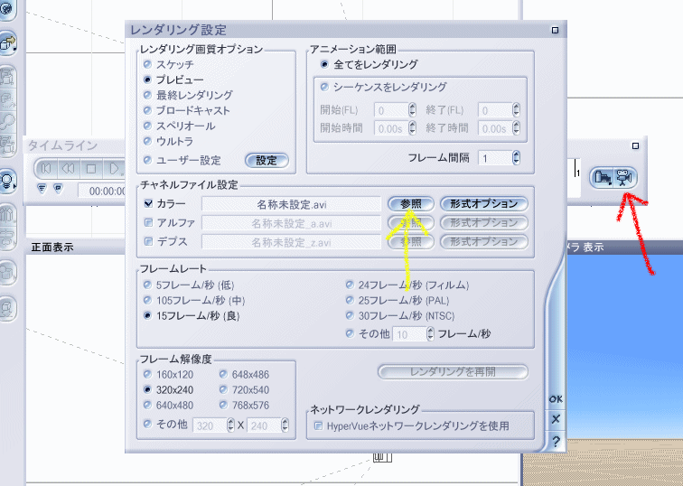 イー・フロンティア・サポートから連絡ありました。とてもわかりやすいお答えです。そもそも上記7月2日の最初の画面で設定するのではなく、左図(画像はクリックで拡大します)のとおり、アニメーションを作る前のタイムライン・ウィンドウの一番右のアイコン(赤い矢印)を押すと、レンダリング設定画面が現れて、そこに参照ボタン(黄色の矢印)があるのでした。確かにレンダリング前にこの画面は見たのですが、「チャネルファイル設定」という言葉の意味がわからず、ここは触らなかったのでした。「レンダリング後の動画保存形式・場所設定」位の日本語で書いてもらえると、多分一回でわかったと思うのですが・・・まあ、また時間があるときにでもやり直します。でも、こうやってみると、Poser のサイトは沢山あっていろいろ教わってためになるのに、Vue のサイトってないですね。こんなこともわからない位ですから。まあここに書いておけば、誰か一人位は検索して役立ててくれるかもしれません。