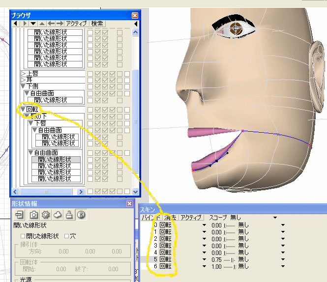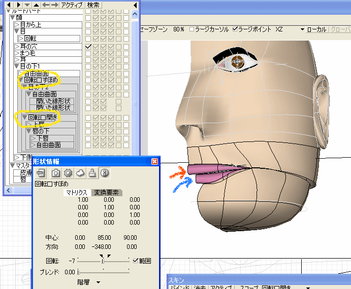はじめて Shade のスキン機能を使ってみました。これでいいんでしょうか。黄色で囲った回転ジョイントの動作を、顔の後と横では無視して、口だけを開けるということをさせてみたかったのです。