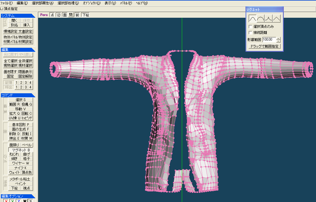 メタセコイアは、面を直接いじれるので、マグネットの数値を0近くまで下げてやると、まさに手で面を変形できるのでした。生まれて初めてメタセコイアをいじったのに、女性用ブレザーを男性用に変更して、さらに服の前を開けるまで約30分。なんていじりやすいソフトなんでしょう。速攻でシェアウェア代金振り込みました。(現在ユーザーID待ち状態)