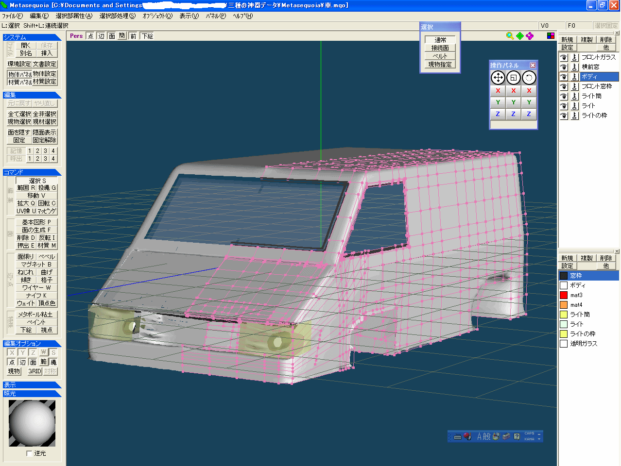 実は、この本を買いまして、せっかくいろいろな本が出ているのだから、まじめに本を見てメタセコイアやってみるかと思ったのでした。リンク先のアマゾンに目次が載っていますが、「3-3 椅子」まではついていけたのですが、「3-4 ギター」から急に難しくなり、本どおりには完成せずに挫折。「3-5 車」の途中まで読んでいるところです。左の図はその車もどきです。急に「下絵を」とか要求されても、そんな図面無いのでできないし、本は下絵があるのを前提に進んでしまうので、一応技術的な点だけを真似してみたという感じです。