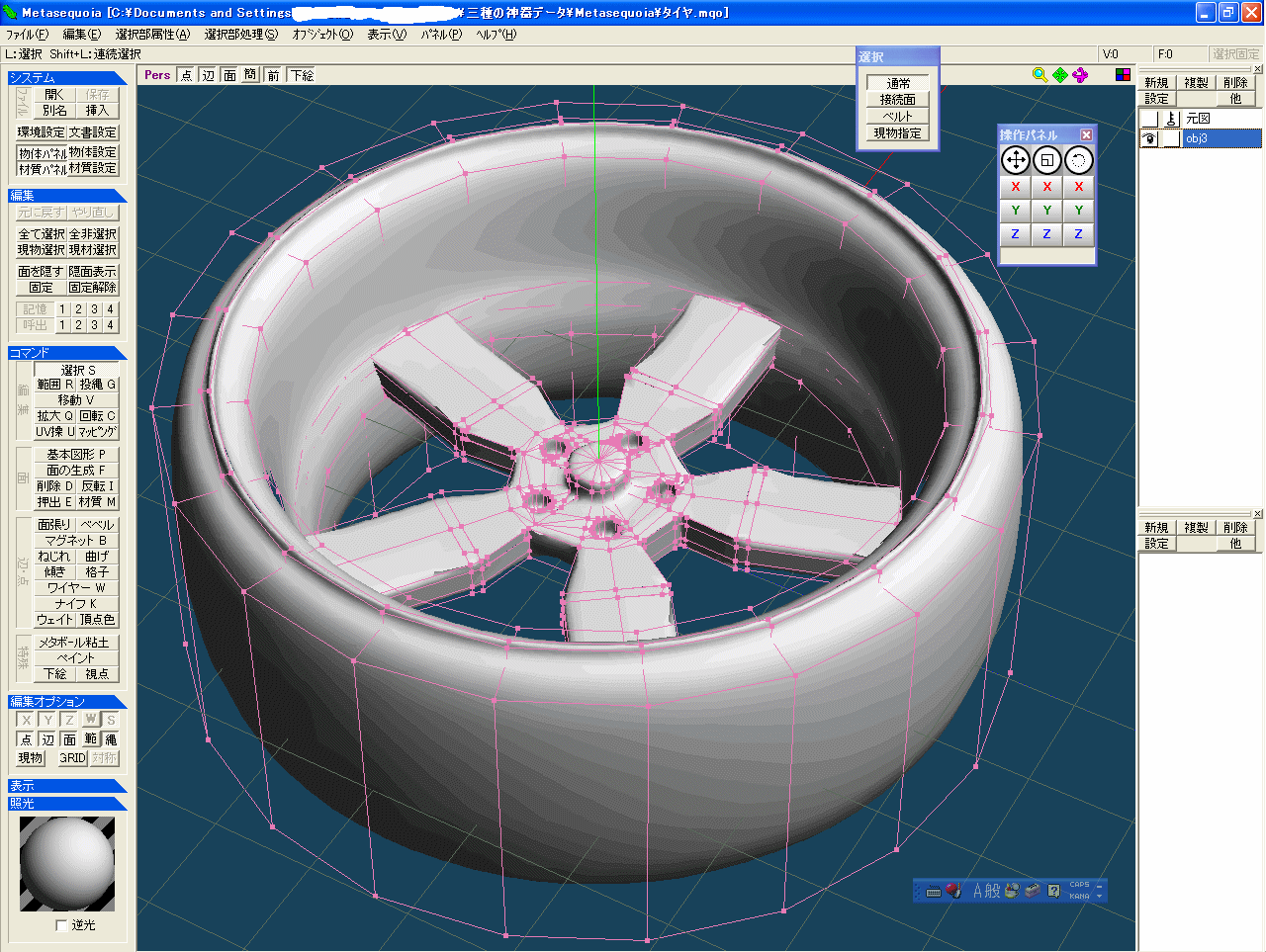 上記、持っている Shade 7.5 のポリゴンメッシュを理解しようと思って本を見ながらいじっていましたが、はっきり言っていじりにくくて使えません。面を選択するだけで一苦労。というか、ほぼ不可能。Shade で挫折したファイルを obj で吐き出して、Metasequoia で編集すると、1分で思い通りに完了。メタセコイア偉大です。Shade 8 はないから知りませんが、Shade 7.5 でポリゴンメッシュを使うのはきっぱりとあきらめました。