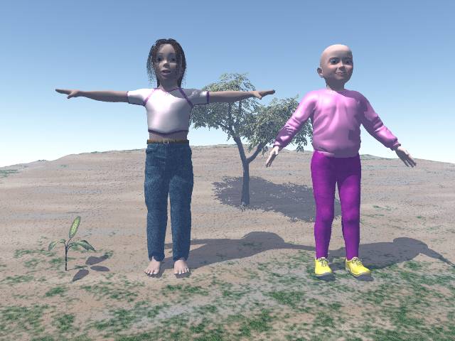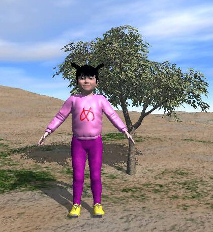 何ということか、まなちゃんは正常ですが、めぐちゃんが禿です。シャツの「め」の字も出ません。しっかりイー・フロンティアさんのサポートに質問しましたが、回答は後日待ちです。めぐちゃんの運命はイー・フロンティアさんにかかっていますので、よろしくお願いしたいところです。でも、やはり Vue で作った外の景色はすばらしいです。草木も簡単に生えるし。