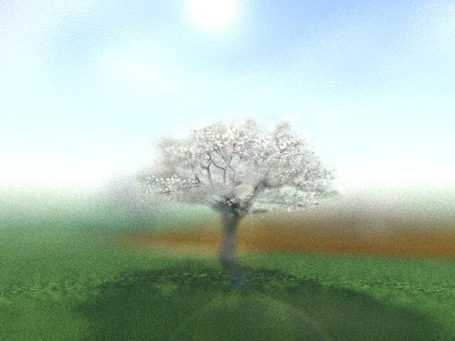 いろいろ本が多くて大変なんですが、「Vue 5 ガイドブック 3DCGでつくる美しい風景」という、日本初の Vue の本が出たので、早速買ってみたのでした。はじめの方には、まだ使ったことが無かった被写界深度設定の話が書いてあったのでやってみました。満開の桜の花だけに焦点を合わせて、後はぼかしてみた絵です。CGでぼかしをやると、ものすごく計算時間食いますね。確かに雰囲気は出ていますが。