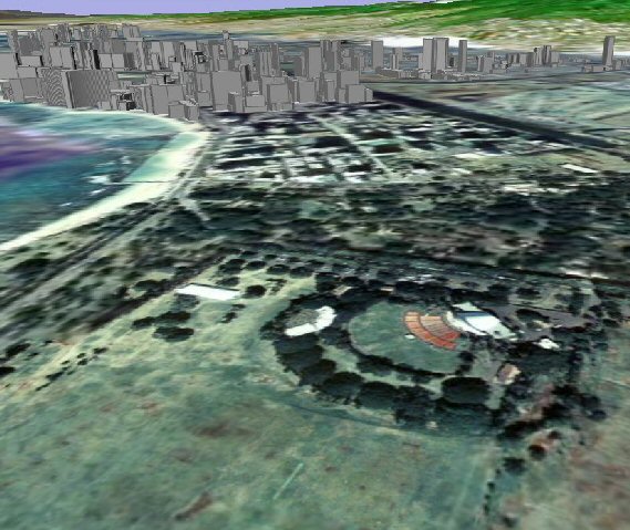 ハワイに飛びまして、オアフ島ワイキキ東部です。このように、ワイキキの西部のホテルしかビルがありません。なので、それより田舎は、真上から見るだけで、傾けて見る楽しみはありません。